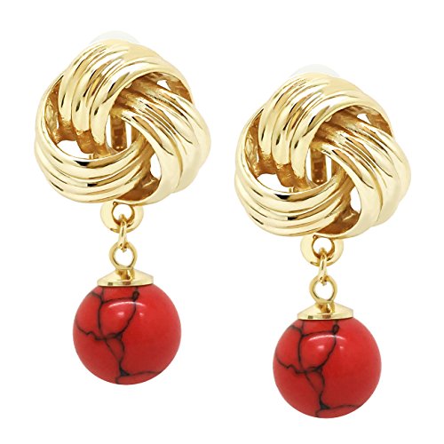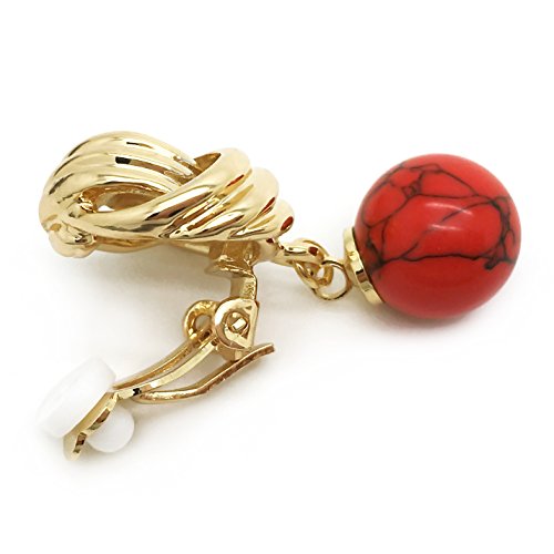 These dangle clip on earrings are made of gold plated alloy with polished finish. Featuring love knot design accented with red resin ball. Perfect for casual day or fancy party wear. For non-pierced ears. Just clip and you are ready to go. These fashion clip on earrings will make the perfect choice for your special someone for Valentine's gift, Christmas gift, Mothers day gift, Birthday gift, Anniversary Gift, or Bridal party gifts.Feature