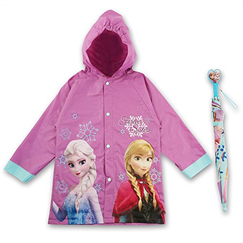 2-Piece matching rainwear set includes rain slicker and matching umbrella featuring the most popular Disney characters Elsa & Anna from Frozen, or Minnie Mouse from Disney Junior