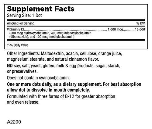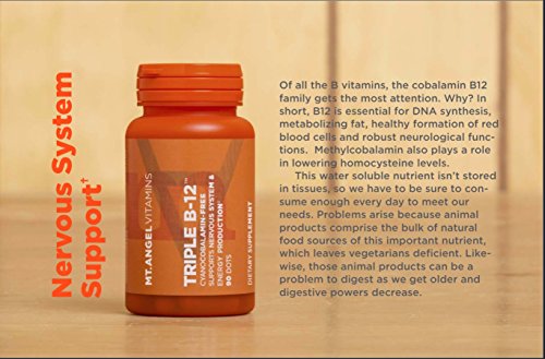 -. Binding : Health and Beauty -. Brand : Mt. Angel Vitamins -. EAN : 0768305022003 -. Feature : Vitamin B12 consists of several members of the cobalamin family. Hydroxycobalamin readily converts to coenzyme forms, particularly adenosylcobalamin - the major form found in the cell mitochondria for energy. Methylcobalamin is found mostly in blood plasma and other body fluids, and plays a role in lowering blood levels of homocysteine. B12 supplementation is particularly recommended for vegetarians and seniors. / Dot absorbed quickly in mouth / Supports energy & Supports nervous system / Supports red blood cell production / Manufacturer Warranty Limited to 1 year. -. IsAdultProduct : 0 -. Label : HIGHLAND LABS -. LegalDisclaimer : These statements have not been evaluated by the Food and Drug Administration. This product is not intended to diagnose, treat, cure or prevent any disease. -. Manufacturer : HIGHLAND LABS -. MPN : A2200 -. PackageQuantity : 1 -. PartNumber : A2200 -. ProductGroup : Health and Beauty -. ProductTypeName : HEALTH_PERSONAL_CARE -. Publisher : HIGHLAND LABS -. Size : 90 -. Studio : HIGHLAND LABS -. Title : Triple B-12 Dots Nervous System Support 90 Dots -. UPC : 768305022003