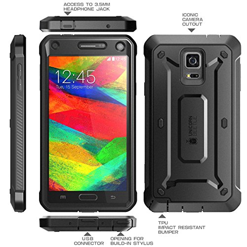 Compatibility: Compatible with Samsung Galaxy Note 4 (2014 Release), allowing full access to touchscreen, camera, buttons, and ports. NOT COMPATIBLE with Samsung Galaxy Note 3 or any other Samsung models. Materials: High grade polycarbonate + thermoplastic polyurethane for shock absorption. Front cover with built-in screen protector prevents scratches without compromising sensitivity. Design: Designed with both protection and looks in mind, SUPCASE Unicorn Beetle PRO Series Full-body Hybrid Case provides shock absorption and scratch prevention while maintaining a sporty profile. - Advanced front cover design for easy installation - Built-in screen protector without compromising sensitivity - Advanced dual-layer (PC + TPU) design provides great impact and shock resistance and prevents accidental drop, bump, and shock - Port cover keeps out debris and dust - Easy access to all features (buttons, camera, speaker, and ports) - Sporty profile and multiple color options - Belt Clip Holster What's in the package? 1x SUPCASE Unicorn Beetle PRO Belt Clip Holster CaseFeature