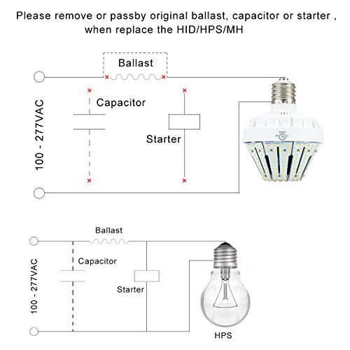 - EASY INSTALLATION - Bulb comes in 6000k light temperatures, and has an E39 mogul screw base, making it a super easy LED retrofit and incandescent/metal-halide replacement. In most cases, just screw in. In others, since LEDs use a driver and not a ballast, you must bypass the ballast (Halide and other bulb types). Consult your electrician.