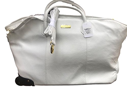 Product Description White Leather Rolling Duffle Carry-On; great gift for her! Oversized dome-shaped duffle with detachable shoulder strap Hardware: Front logo plate; goldtone Exterior: Genuine pebbled leather shell Interior: Polyester lining luggage- Approx. 20"L x 10-1/2"W x 14" H Approx. 4" handle drop Approx. 46" adjustable shoulder strap Handles: Double barrel; telescopic recessed; adjustable, detachable shoulder strap Wheels: In-line skate 0