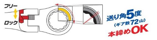 Gear number 72 Mountain feed angle A high efficiency gear wrench adopting a flex mechanism (head swing) for a gear wrench of 5 degrees.