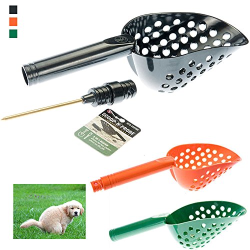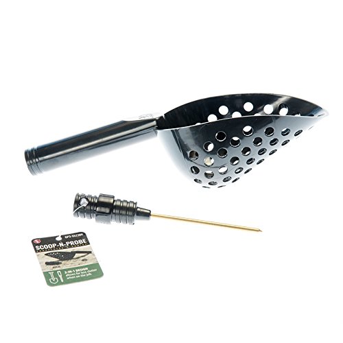 This 14" sand scoop with hole and brass probe is great for gold panning and metal detecting. This scoop n probe will help you dig those treasures out of the ground. You can use it a a metal detector and / or sand scoop, for scooping items out of sand and loose soil and gravel, and it also has a very nice brass probe for probing items without damaging or scratching them. 2 in 1 Design allows for less clutter when on the job. Measures: Closed Length : 13-1/4", brass Probe Length : 4-1/8". Use the double ended screw to attach the probe to the handle. Available colors: Orange, Green and Black. Color is shipped randomly.