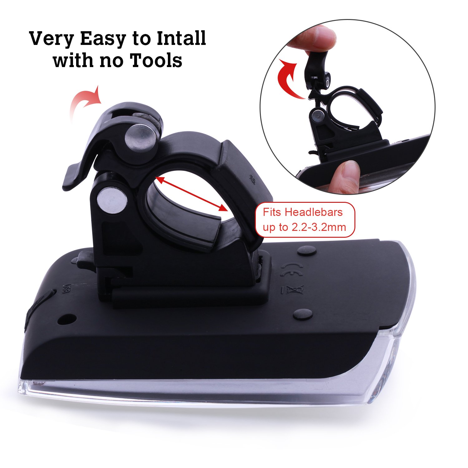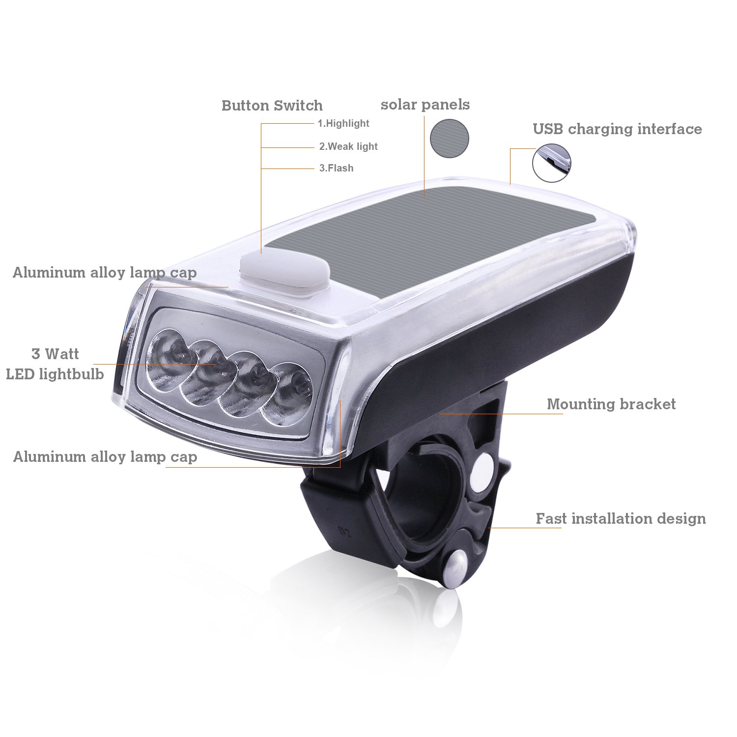 With USB rechargeable bicycle light, with USB cable attached, USB cable can be connected to personal computer, mobile power supply, etc., it can be charged immediately, very convenient, environment friendly.