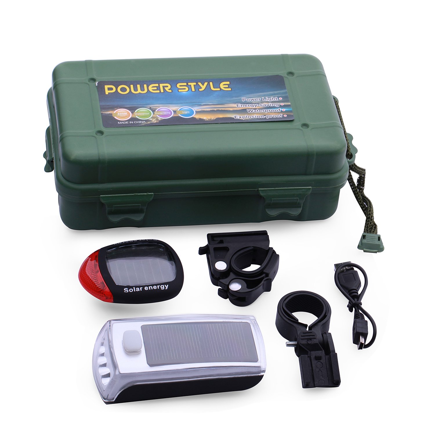 1 * Bicycle front light, 1 * Front light mount, 1 * Bicycle tail light, 1 * Tail light mount, 1 * USB cable