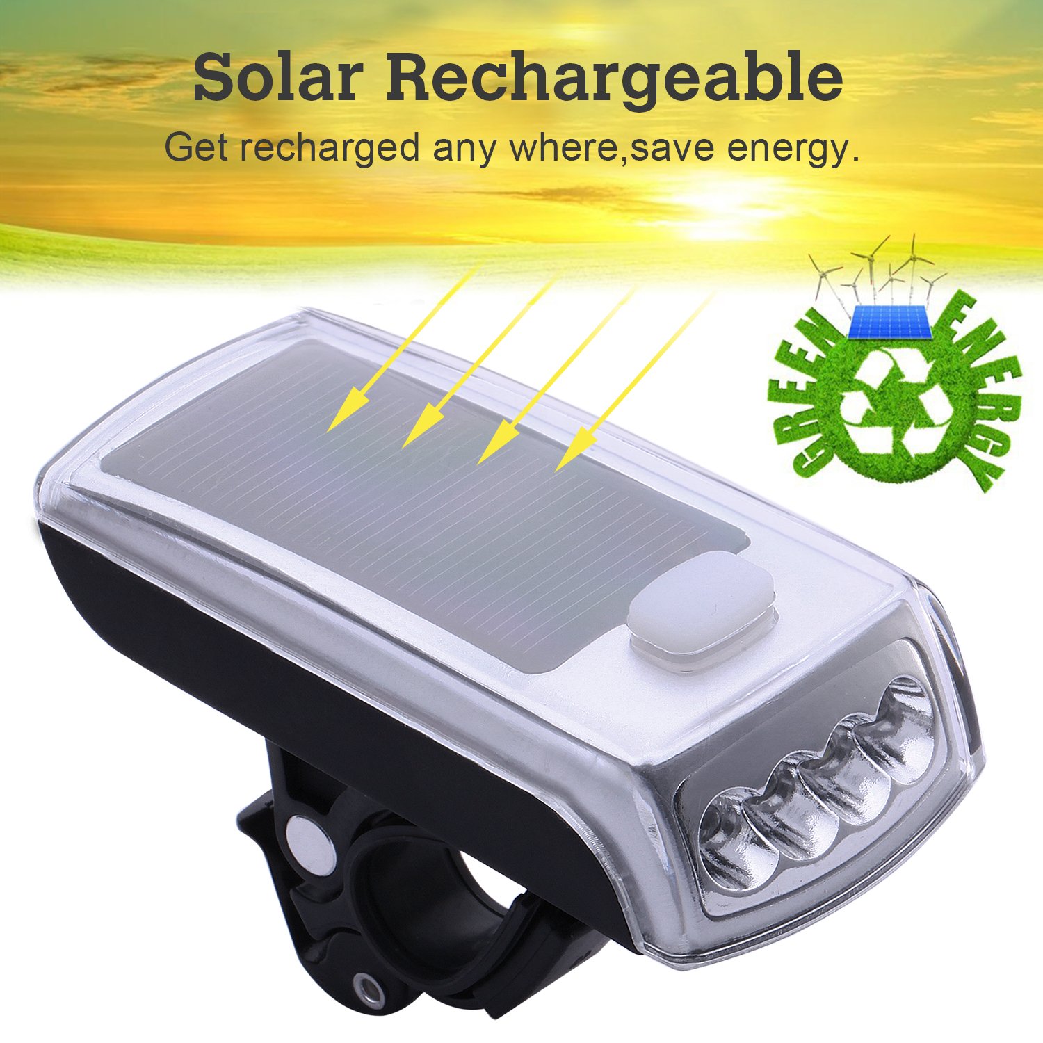 It works with battery with solar panel, headlight and back light can be charged with solar energy and can be charged with the included USB 2.0 cable (included in the package).