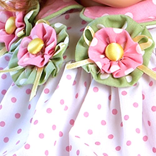 "Tutti Fruity" is so playful in her polka dot dress, with layers of colors she is a favorite. Her dress is embellished with yo-yo rosettes topped with buttons and bows. She wears crisp, white pantaloons and playful pink sandals. Her hair style is adorned with 2 coordinating hair bows.