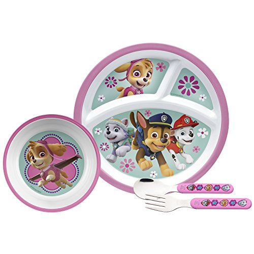 Set includes 3-sectioned plate, bowl, spoon and fork; all feature graphics from Paw Patrol Girl