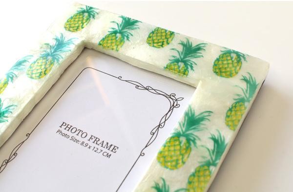fk094igrjsフィリピンの海で取れたカピス貝を加工して作ったフォトフレームです天然素材のため、それぞれ異なった表情を楽しめます サイズ 約14×H18cm、内寸:約W8×H12cm 個装サイズ:15×20×2cm 重量 個装重量:150g 生産国 フィリピン ワインポイントのパイナップルが可愛いトロピカルデザイン フィリピンの海で取れたカピス貝を加工して作ったフォトフレームです天然素材のため、それぞれ異なった表情を楽しめます