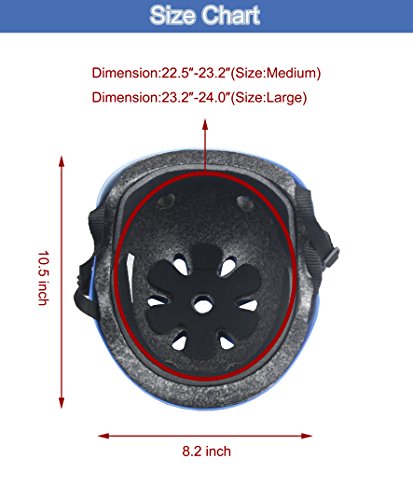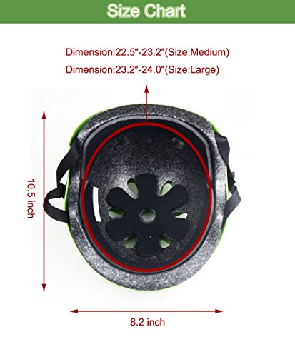 -. Feature : Complies with the European Standard:CE(EN 1078:2012+A1:2012),the skateboard helmet adopts durable tough shell with soft liner which could absorb external pressure caused by crash in skating activities. Adult wear the scooter helmets will feel much safer and more confident, and thus perform better in sports activities. / Material: ABS Outer Shell & inner EPS high-density foaming,As designed with multiple vents, special aerodynamic design and breathable foam, the skate helmets help reduce sweating and keep men and women feel cool even during intense body movement, which considered as cool helmets for skateboarding or roller skate. / The skateboarding helmets equipped with adjustable straps for adult to adjust flexibly to get a better fit. / Anatomically formed., the cool helmets are widely used in skating activities such as skateboarding, roller skating, inline skate, scooter, rollerblading, longboard and two wheel electronic board. As play great protective function during these activities, the skateboard helmets are considered as the best helmets for skating activities. / This Helmet is great for adult. Pls measure the circumference of your head before placing orders.Size Chart: Medium:22.5"-23.2"; Large:23.2"-24.0",