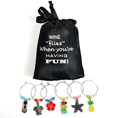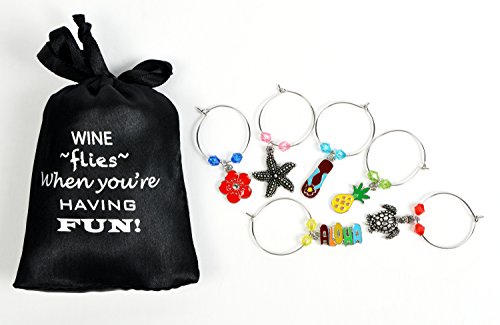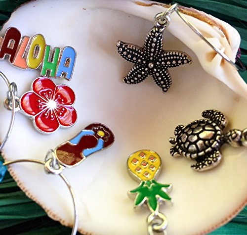 -. Title : Hawaiian Beach Tropical Wine Glass Charms, Hand Painted - Set of 6 with Sateen Storage Bag