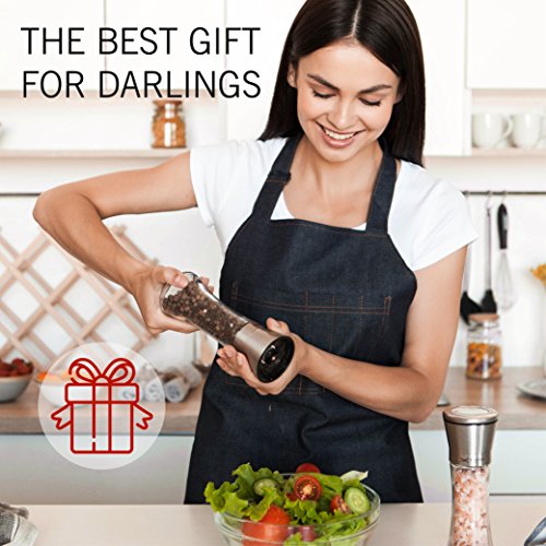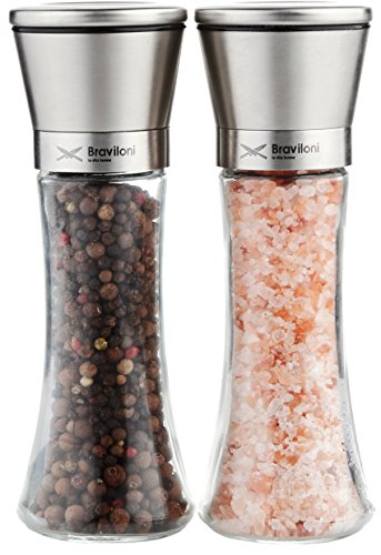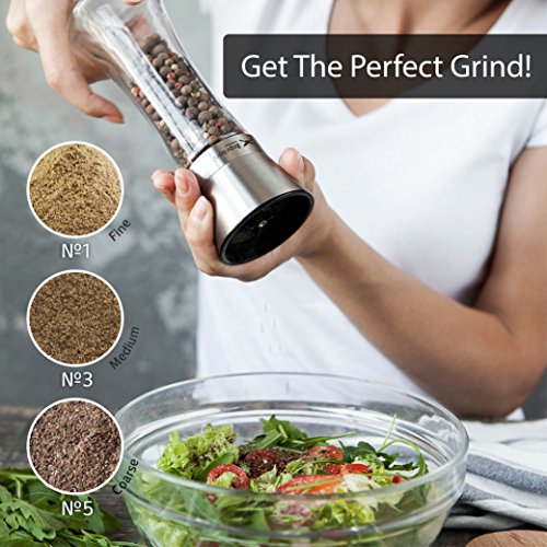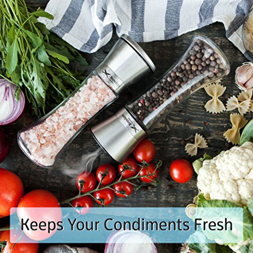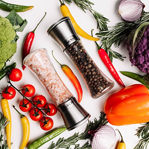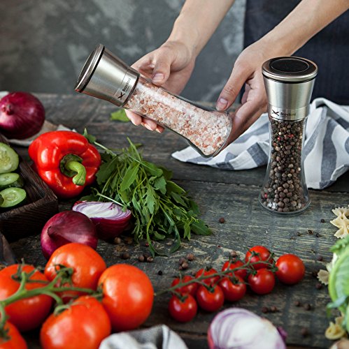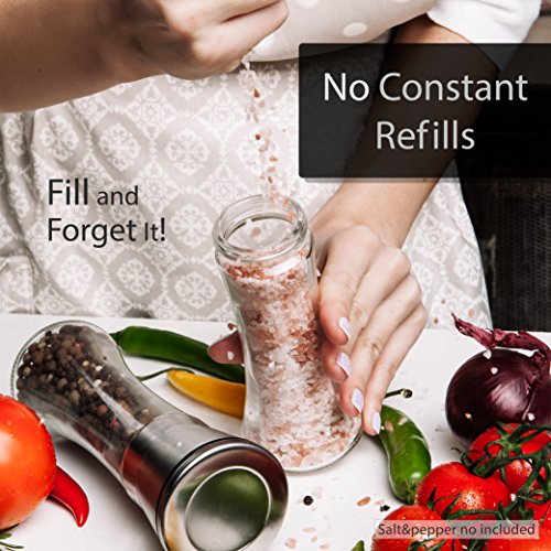 -. Feature : ✅ GET THE PERFECT GRIND: This pair of identical salt and pepper mills is fitted with a high quality ceramic grinder that is non-corrosive, doesn't absorb odors, and gets the job done every time. Choose between 5 levels of grind from coarse to fine by simply adjusting a plastic knob at the top. / ✅ MESS FREE OPERATION: You'll never have to deal with spices spilling on the countertop again. The grinding mechanism is at the top of the shakers, unlike standard grinders that have theirs at the bottom. Simply grind your favorite spices with a turn of the wrist; no more frustratingly noisy electric spice grinders. / ✅ NO CONSTANT REFILLS: With an ample 3⁄4 cup capacity, you won't have to keep refilling these 7.5" tall and 2.5" wide salt and pepper grinders. The conveniently wide mouth makes it a breeze to fill them with all types of salt and peppercorns; no funnel required. / ✅ KEEPS SPICES FRESH: Whether it's pink Himalayan salt or black pepper, these mills keeps it perfectly fresh thanks to the tight seal the cap creates. Your spices will be kept away from moisture and dust, with the glass base preventing absorption of flavor unlike wooden grinders. / ✅ LOOKS SIMPLY STUNNING: The beautiful clash of glass and stainless steel gives this grinder set an elegance that will spruce up your kitchen and thoroughly impress guests at the dinner table. It makes the perfect holiday or anniversary kitchen gift.