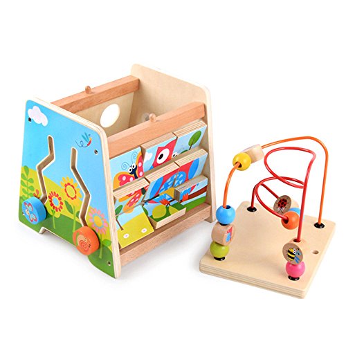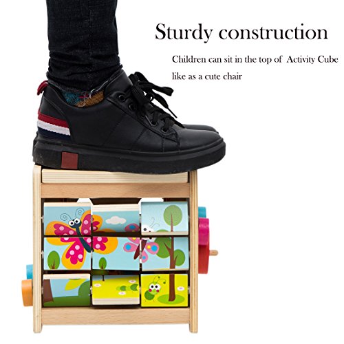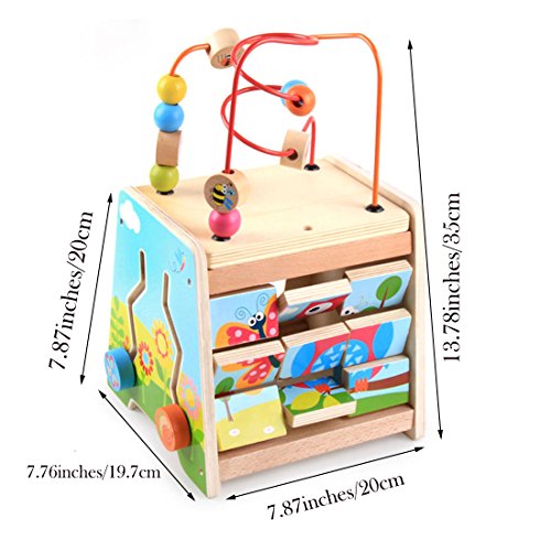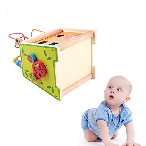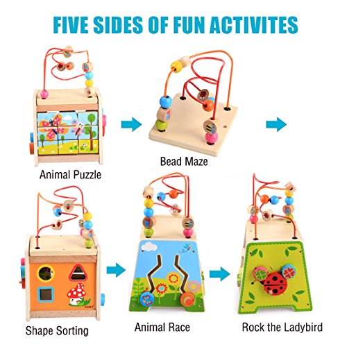 - ▶▶▶This kids' wooden activity cube is complete with 5 sides of activities to play with, including a bead coaster, shape sorter, animal puzzle, animal race, and rock the ladybird. . It is highly stimulating, making it an ideal addition to your little one's play time and learning accessories. It allows children to figure out how things work to improve their thinking skills all while having fun and to learn about different shapes that exist to broaden their knowledge while developing special recognition.