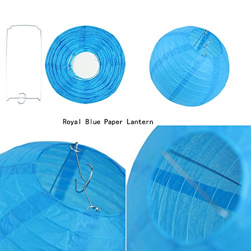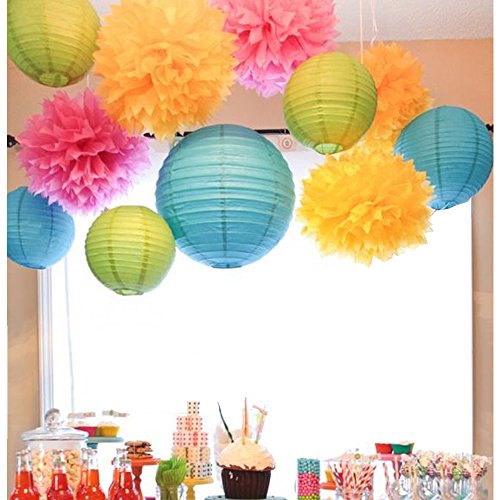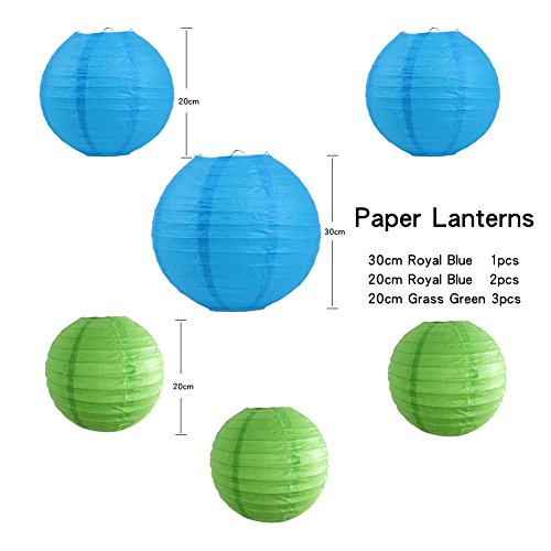 Package included: Total 11pcs. 1pc 30cm royal blue paper lanterns,2pcs 20cm royal blue paper lanterns,3pcs 20cm light green paper lanterns,2pcs 30cm fuchsia pom poms(round edge),3pcs 30cm yellow pom poms(round edge).