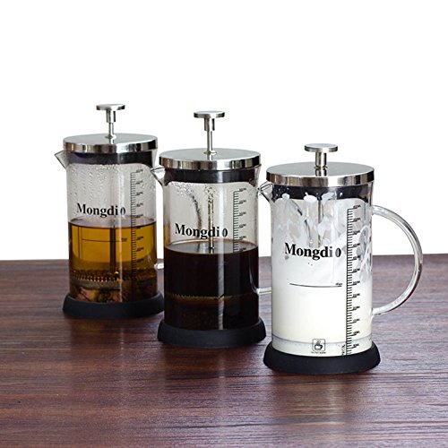 -. Feature : GOOD QUALITY §®§¡§´§¦RIAL COMBINATION - Main body is made of high borosilicate glass - the worldly recognized healthy and environment-friendly material for making kitchen utensils, which is corrosion preventive, heat-resistant and durable; the other parts (including the lid, plunger and strainer) are made of stainless steel; rubbery silicone rim fits onto the bottom, which is more soft, anti-skid and anti-scald, and will not be deformed by external / TWO CUPS - It is 7" tall (counting the plunger) and the base is 3 3/4" across. If your coffee mug holds 10 ounces, this press would make two cups / GRADUATION INDICATION - The glass body is featured by visible graduation, and with it, you don't have to worry about different portions and tastes anymore, and you can completely handle them / SPECIALLY DESIGNED HANDLE - the handle is crescent-shaped and built in; it is perfectly integrated with the main body whether from the perspective of appearance or from comfortable feel in hand, but glass handle wouldn't get hot / STRENGTHENED SP.R.ING & FINER STRAINER - with them, filtration can be done effectively and service life can be prolonged; they can be used more than 30,000 times