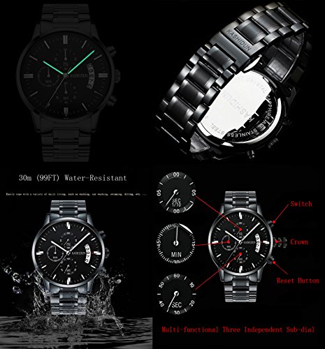 Watch for hard surface of the sapphire crystal lens, steel waterproof, Dial face with coated luminous hand indicators, 3 independent hand indicators, chronograph and 1.55-Volt battery will last approximately
