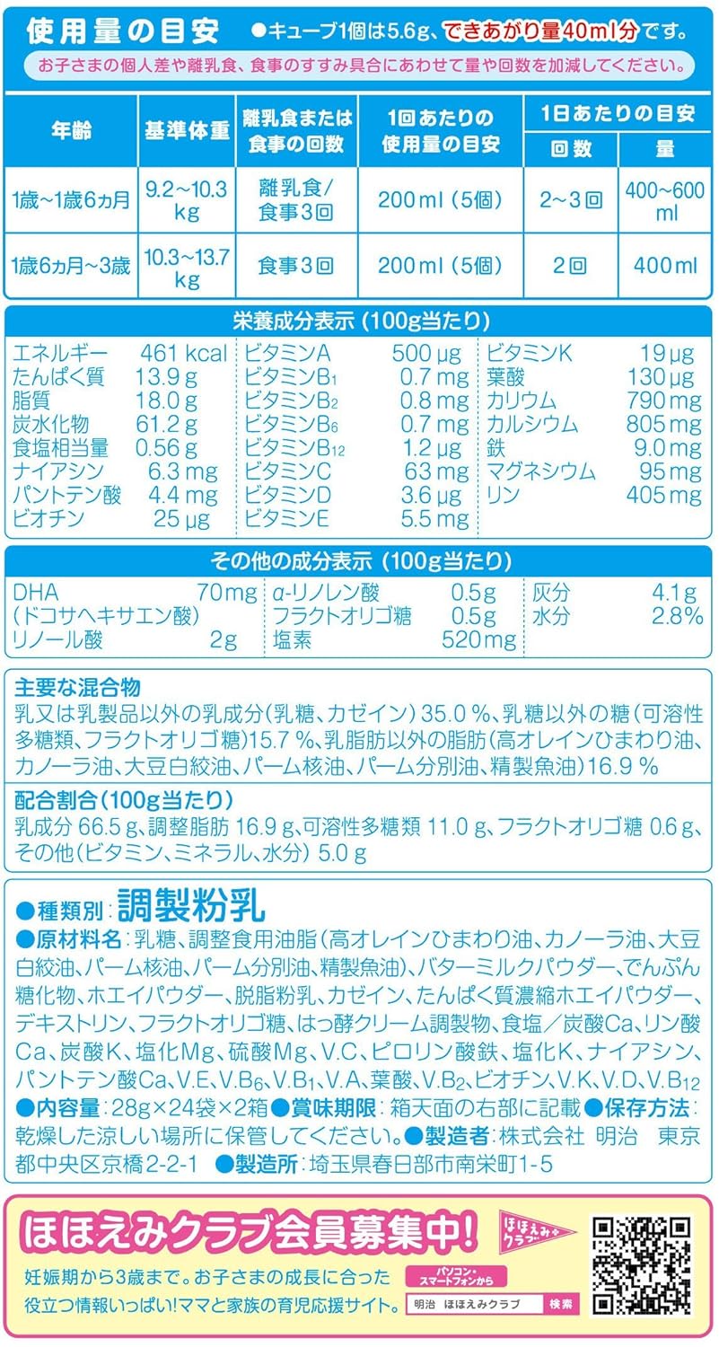 原材料: 乳糖、調整食用油脂(高オレインひまわり油、カノーラ油、大豆白絞油、パーム核油、パーム分別油、精製魚油)、バターミルクパウダー、でんぷん糖化物、ホエイパウダー、脱脂粉乳、カゼイン、たんぱく質濃縮ホエイパウダー、デキストリン、フラクトオリゴ糖、はっ酵クリーム調製物、食塩/炭酸Ca、リン酸Ca、炭酸K、塩化Mg、硫酸Mg、V.C、ピロリン酸鉄、塩化K、ナイアシン、パントテン酸Ca、V.E、V.B6、V.B1、V.A、葉酸、V.B2、ビオチン、V.K、V.D、V.B12
