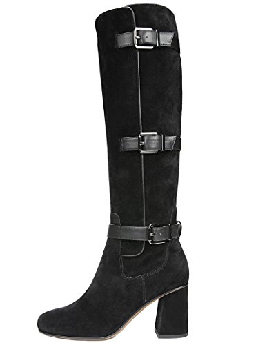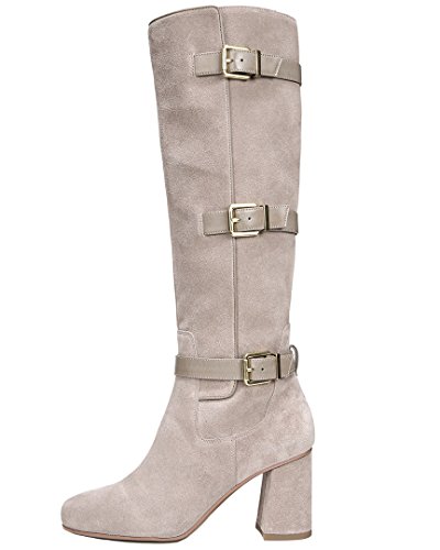 Product DescriptionSophisticated design to cherish for seasons to come. Suede upper, three strap leather detail. Almond toe. Inner zip closure. 15 and 3/4 inch shaft height, 14 inch circumference. 3 inch suede covered block heel.0