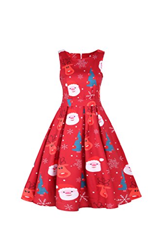 OQC Women's Sleeveless Christmas Santa Claus Print Cocktail Party Flared Dress with Belt, Red, Small