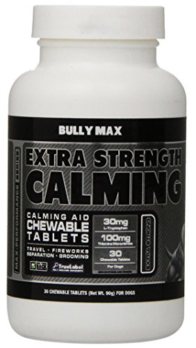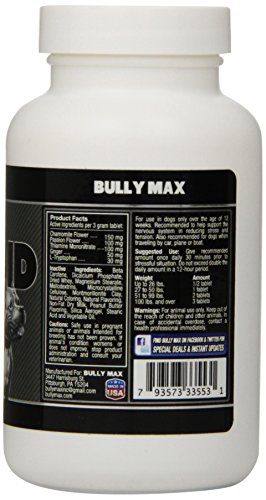 This is the Bully Max (30 day supply) calming aid and pet relaxant. It can be used for many situations including, seperation anxiety, stressful travel situations, loud noises, firewords shows and dogs who are afraid of thunderstorms. It provides great calming in these and many other stressful situations.The product is all natural and can be used by all dog breeds over the age of 12 weeks.This product is approved, designed and recommended by veterinarians. Bully Max calming aid is made is the USA with only the finast trusted ingredients.Feature