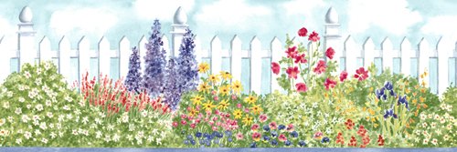 -. Feature : Watercolor image of Picket Fence with flowers. / Gardening Wallpaper Border / 15 Foot Long Spools, Prepasted / 7 Inch Wide Border / Flowers Wallpaper Border - Iris, Daisy