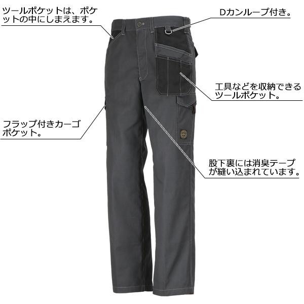 ツールポケットは工具などを収納できる大型のものです。長細い工具やフラッシュライト、ペンなどを入れるのに適しています。使用しない場合はポケットの中に収納でき、見た目もかさばらないので便利です。ウエストはアジャスト機能付きで、後ろのポケットは左側がフラップ、右側が玉縁ポケットになっています。 |