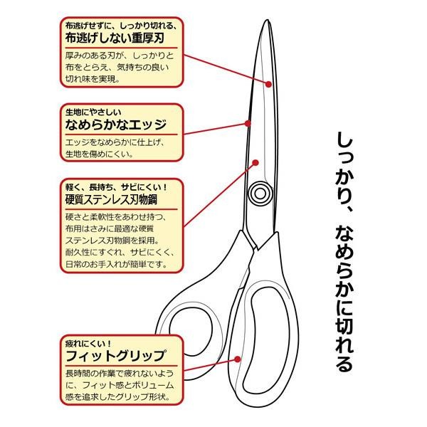 fk094igrjs手にフィットして握りやすいグリップステンレス刃物鋼使用なのでサビに強く、扱いやすいステンレスはさみです サイズ 240mm 個装サイズ:30×9×3cm 重量 個装重量:210g 素材・材質 刀部/硬質ステンレス グリップ/ABS樹脂 サック/オレフィン系樹脂 仕様 布用 生産国 日本 布逃げせずしっかりと切れるステンレスはさみ 手にフィットして握りやすいグリップステンレス刃物鋼使用なのでサビに強く、扱いやすいステンレスはさみです
