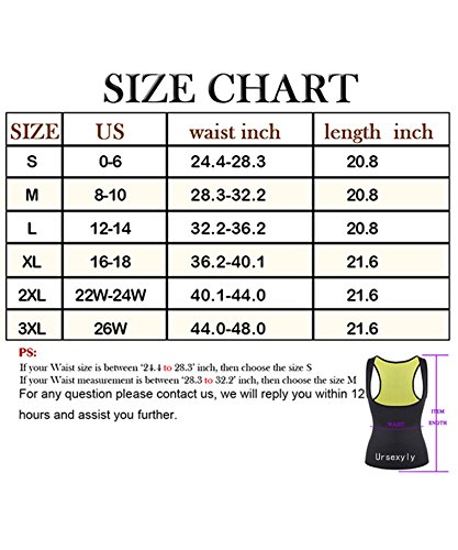 -. Feature : ♦Users♦: All lady who pursuit beauty sexy body slimming for all party such as Christmas which include women require Postpartum Rebuilding, fitness enthusiast. Which causes you to have better posture and engage your muscles when you are / ♦Promotes Body Heat♦: The Neoprene Slimming Sauna Shapewear Vest intensifies perspiration in your core more than regular gym-clothing during exercise; Anywhere that cover with this vest will sweat like you are in a sauna and theoretically sweating means burning fat / ♦Bullet Point♦: No zipper design easy to wear. It's special material-Neoprene makes you sweat like there is no tomorrow, increases body temperature and soaks it all up and you will feel dry the entire time / ♦Fabric & Material♦: neoprene comfortable, lightweight stretchy fabric garment. This Fat Burner Tank Top Vest Shirt have some material smell, it's pretty normal and would be gone after a few time washes. It is long enough to cover that bothersome pooch / (S) Size: Waist 24.5-28.5 Inch; (M) Size: Waist 28.5-32 Inch; (L) Size : Waist 32-36 Inch; (XL) Size : Waist 36-40 Inch; (2XL) Size :Waist 40-44 Inch; (3XL) Size :Waist 44-48 Inch