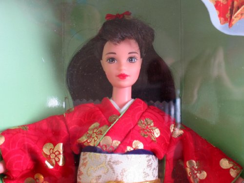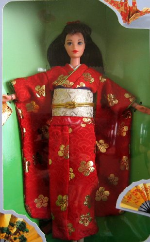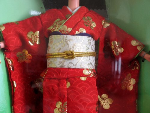 Includes: 11.5" Barbie Doll w/black hair & brown eyes. Doll wears a beautiful red w/shimmery gold floral print satiny Furisode type Kimono w/a white w/gold Sash (Obi) around her waist; Obi is tied & held on w/a gold tone "cord" (Obi Jime). Barbie Doll also wears a sleeveless white white Slip & a white Waistband under the Sash. Information regarding Barbie Doll's garments are detailed inside the box cover. Doll also wears Traditional Japanese Sandals & comes w/a shimmery gold Clutch Bag.