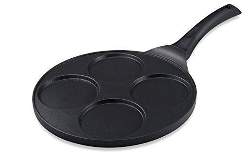 4 perfect pancakes, coming right up!Kids and adults will flip for your gourmet mini breakfast delights made with the Blini Pan by Gourmia. This versatile oven top skillet helps you create small, evenly cooked silver dollar pancakes in perfectly round bite-sized shapes. The pan's premium cast aluminum design delivers optimal heat transfer for a yummy batch every single time. You don't need an expensive electric griddle to make chef quality cakes, crepes, blintzes, and more from home. Simply scoop a helping of batter into each disc, wait for them to bubble, flip, and enjoy!