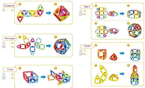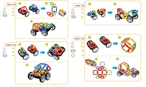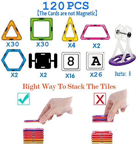[What is Included] Total 120 pieces (with bonus 8 pieces), including one big Ferris wheel set (8 component), 30*Triangular, 30*Square, 2*Trapezoidal, 4*Long Triangle, 2*Hexagon,and 2*Wheels magnetic titles plus 26*Alphanumeric Cards, 16*Digital Cards (Not Magnetic), 2 different random colors on each side of each magnetic tile. More pieces in box with lower price. Compatible with other similar-size tiles, such as megna tiles, etc.