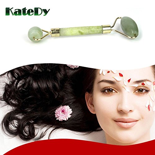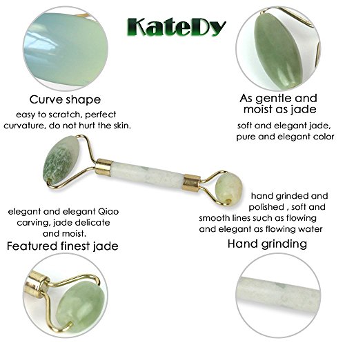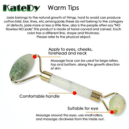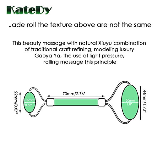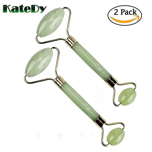 KateDy 2pcs Jade Roller Massager Therapy 100% Natural Jade Facial Roller,Slimming Tool for Male Female Face Neck Body Skin SPA Scraping Tools Rejuvenates Your Skin,100% Real Natural Jade,Anti-Aging Beauty Skincare Tool Jade facial rollers were used to prevent the lost of skin elasticity,promote circulation and integrate natural energy from the jade stone.Daily use of this face roller can reduce the amount of time needed in a spa.It is easy to use and can be use anytime and anywhere.Jade stones have tremendous amount of good energy that will have a positive effect on your skin.Soon after daily uses,your skin will feel tighter,more rejuvenated and shines with a natural glow.