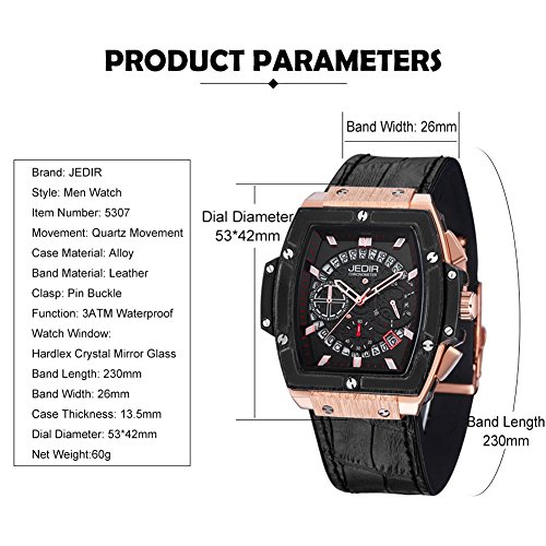 -. Binding : Watch -. Brand : Jiangyuyan -. Department : Mens -. Feature : Case Diameter: 42*53 mm Approx.Case Thickness: 13.5 mm Approx.Band Length: 265 mm Approx.Band Width: 26 mm Approx.Net Weight: 70g Approx. / 1. Luminous Hands glow after absorbing light. / 2. Water resistant to 99 feet (30 M). / 3. 3 sub-dials and calendar window are all functional. / 4. Quartz movement with analog display and accurate time keeping. -. Label : JEDIR -. Manufacturer : JEDIR -. MPN : 530701 -. PartNumber : 530701 -. ProductGroup : Watch -. ProductTypeName : WATCH -. Publisher : JEDIR -. Studio : JEDIR -. Title : JIANGYUYAN Men Fashion New Luxury Brand Pirate Hollow Leather Clock Male Casual Sport Watch