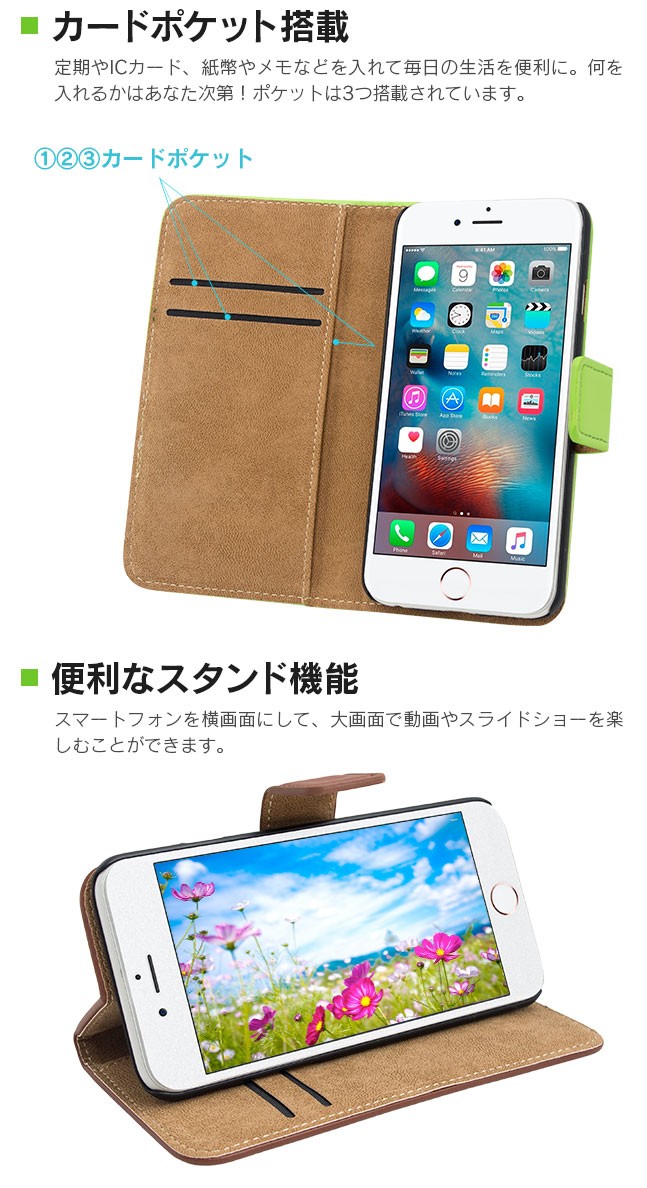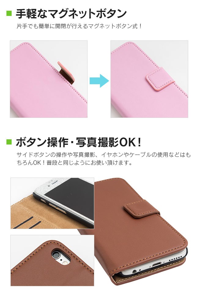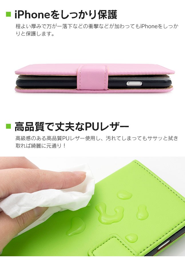 | 仕様 | 毎日使うものだから長く使いたい! どんなシーンでも合うシンプルで機能的なデザインの手帳型ケースです。 老若男女問わずお使い頂きたいため、カラバリ豊富にご用意いたしました! ・定期やICカードなどが入るカードポケットを3つ搭載!何を入れるかはあなた次第! ・スマートフォンを横画面にして大画面で動画やスライドショーを楽しむことができるスタンド機能搭載! ・程よい厚みで万が一落下などの衝撃が加わってもiPhoneをしっかりと保護! ・高級感のある高品質PUレザーを使用し、汚れてしまってもササッと拭き取れば綺麗に元通り! ・片手でも簡単に開閉が行えるマグネットボタン式 ・サイドボタンの操作や写真撮影、イヤホンやケーブルの使用などはもちろんOK!普段と同じようにお使い頂けます。 |