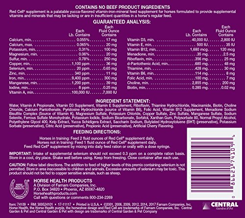 32 oz. Red Cell Pellets that supports normal blood cell health, essential for transporting oxygen, maintaining energy and meeting performance demands. Industry standard vitamin mineral supplement for fueling champion horses. Contains 300 mg of chelated iron per oz., potent, homogenized for maximum consistency and reliable. Palatable yucca flavoring.Feature