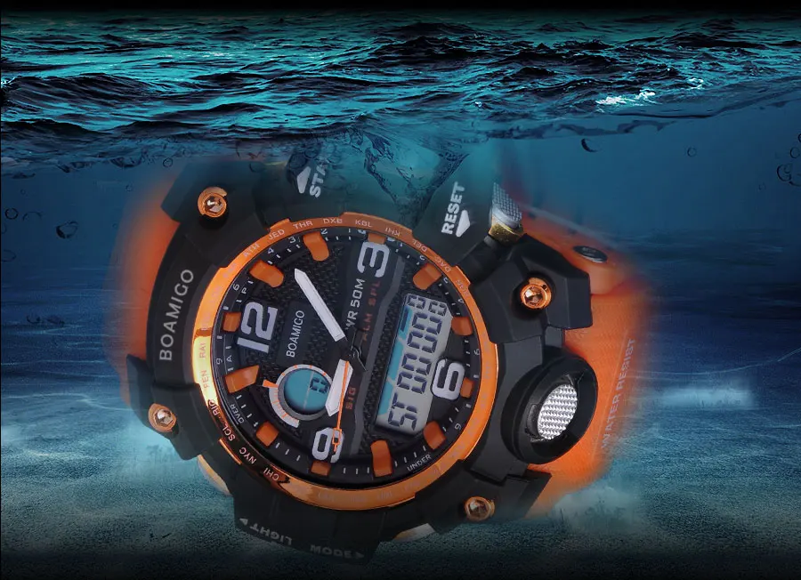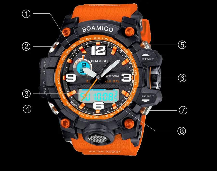 Feature:Water Resistant,LED display,Multiple Time Zone,Stop Watch,Complete Calendar,Back Light,Chronograph,Auto Date,Week Display,Swim,Alarm