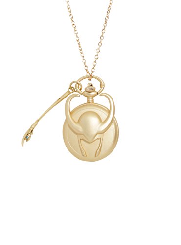 Studio : Hot Topic Publisher : Hot Topic Binding : Apparel Product Description While time may not move on Asgard the way it does on earth, you can still keep time in Asgardian style. This matte golden tone pocket watch necklace features Loki's helmet, and has a push button opening to reveal a black faced watch. The necklace has a Chitauri Scepter charm. 0