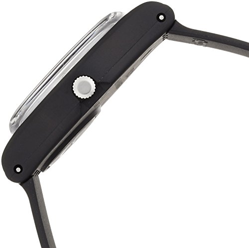 Black plastic watch featuring round white dial with Arabic hour markers and luminous baton-shape hands