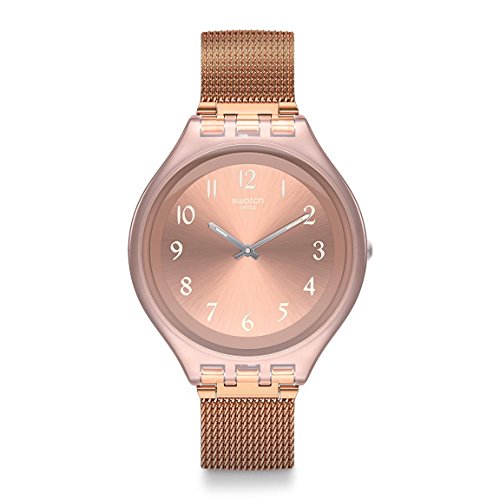 Swatch Skin Skinchic Pink Dial Stainless Steel Ladies Watch SVUP100M. 40 mm semitransparent pink plastic case with a pink dial, a plastic crystal, silver tone luminescent hands, and silver tone Arabic numeral hour markers. Printed logo beneath the 12 o'clock position. Hands: hours and minutes. Case thickness of 6 mm. Push / pull crown. 17 mm rose gold tone stainless steel bracelet with a sliding buckle clasp. Quartz movement and water resistant up to 30 meters. Skin series.Feature