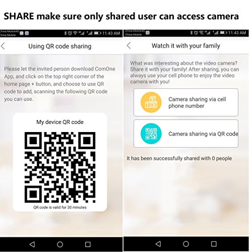 -. Feature : [Super Security and Easy Share] Some People doubt that home Wifi guest users can watch real video. A :The master Owner bind the camera with QR code, and master can share access right to his family with mobile phone number or QR code. B: Only owner UN-registers this camera in APP, other people can connect this camera 。 / [Face Recognition] This is first face recognition security camera. With Face Recognition, alarm will distinguish security staff and dangerous staff in motion detecting mode / [Sensitive Motion Detection and Alarm message ]: it is sensitive, and fast send alarm message to you with APP. / [IR Night Vision]: In Neight Vision, you can watch the real black and white video. It is not good enough compared with professional night vision camera, but it is usable for your home security both in house and yard. / [Two ways talking] You can communicate between camera and phone , it is very important at baby care old man care and other