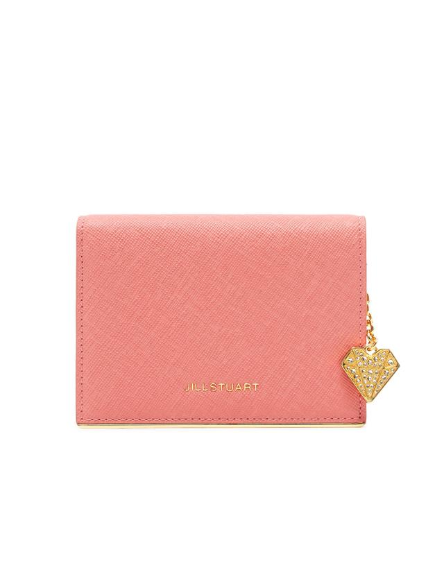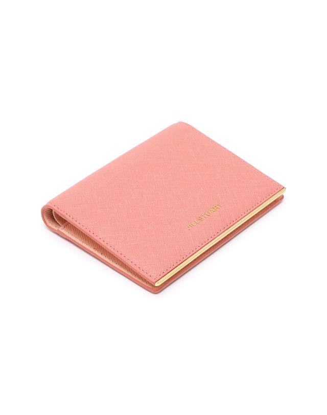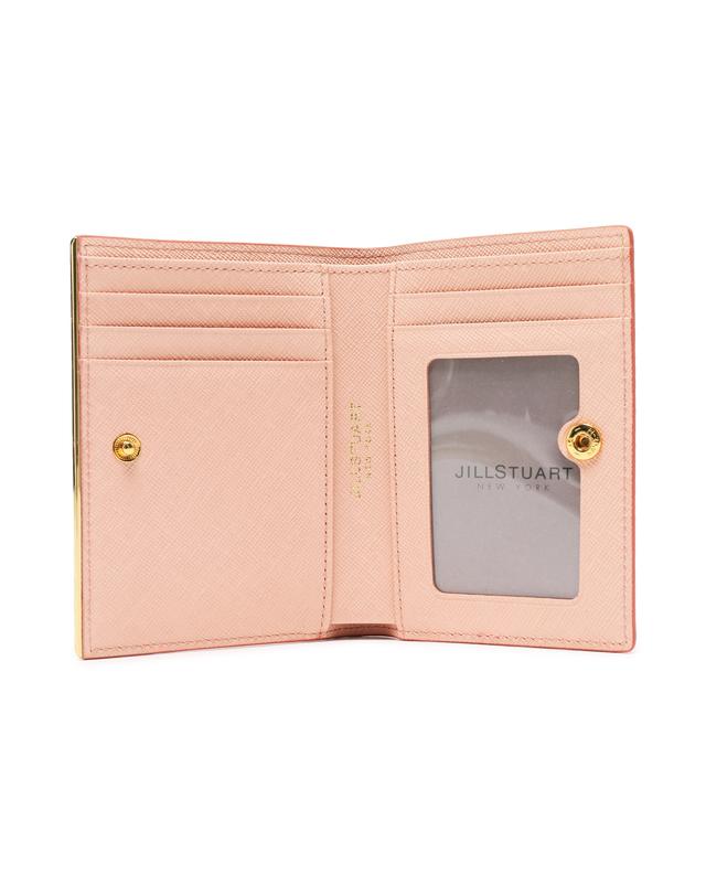 내부 베이비 핑크 배색으로 여성스럽고, 심플한 외관을 보여주며, 하단의 로고와 골드 바 장식으로 포인트를 준 2단 반지갑입니다.