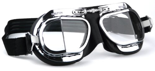 -. Feature : APPROXIMATE DELIVERY TIME 10 DAYS (Contact us for more Information) / A british hand stitched and hand made classic motorcycle goggle/ classic flying goggles / Soft PVC leather facemask hand stitched around foam for added comfort / Goggles fitted with clear polycarbonate angled lenses, shatterproof/ scratch resistant and 99.9% UV protection - Goggles meet British Safety Institution Standard (BSI - BS4110) / Chrome plating (No rusting!) over solid brass frames for that unique stylish look