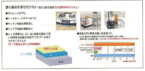 ●メッキ鋼板(GI,GF,GL)表面の極めて薄い特殊防虫皮膜の効果でゴキブリが寄り付かなくなります。