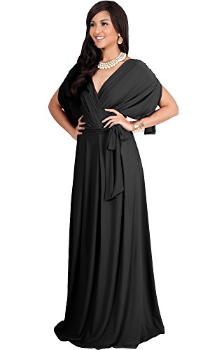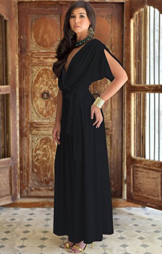 A very elegant designer maxi dress from Koh Koh. This beautiful short sleeve maxi dress features batwing or dolman sleeves, a crossover chest and a pleated empire waist skirt which provides the design with a lovely flow when walking. In addition, the design has an elastic waist which will ensure that this design is a wonderful fit for all body shapes. This super versatile maxi dress design makes for the perfect all-rounder, it can be worn as a cocktail dress, evening dress, formal dress, or even as a maternity dress or pregnancy maxi for those expectant mothers. The design is an understated glam design, perfect for wedding party dresses, bridesmaid dress, mother of the bride dress and mother of the groom dress. Many ladies have used the white of ivory color as a wedding dress. These versatile maxi dresses are available in color Black and size Large / L / 12-14.