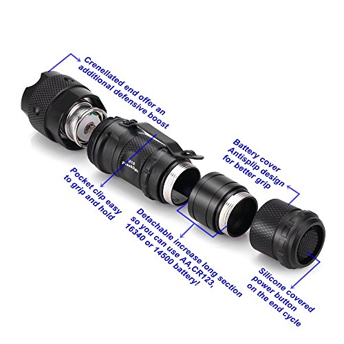 -. Feature : Flashlight machined hard anodizing aluminum alloy body solidly constructed make it very durable dependable and scratch resistant.10.6cm length easily operation with one hand. / Flashlight led using precision optics convex lens makes it throws a good spotlight beam make the lighting is more focused clearly and Greater range,save energy. / Led flashlight of battery compartment is o-ring sealed to be water resistant.unscrew the cap,insert 1 x AA battery,1 x CR123 battery,1 x 16340 or 1 x 14500(not included). / The tail cap of flashlights has a click on click off button,press down on the power button halfway to change high,low and strobe 3 modes.only have remember on high mode. / The tactical flashlight have a tenaciously belt clip hangs,suitable for carrying around to take Outdoor Sports and Indoor Activities (Riding,Camping,Hiking,Hunting,etc).