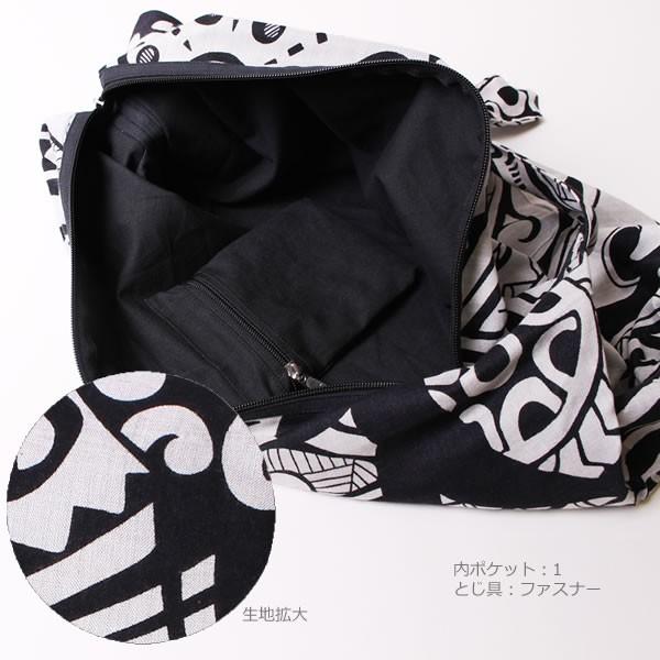 | 商品詳細 | <サイズ> 50cm×37cm×マチ11cm持ち手110cm とじ具ファスナー <素材>表地レーヨン・裏地綿 |