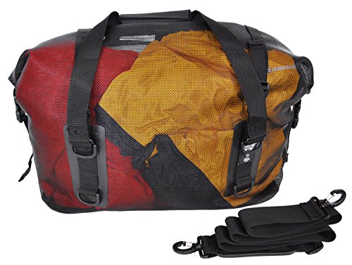 -. Feature : Heavy-duty vinyl mesh, reinforced webbing straps and handles / Durable plastic hardware / RF welded seams / Wide mouth roll-top closure for hassle-free loading and unloading / Over-the-top compression straps