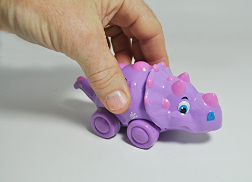 T-Rex head bobs up and down as it rolls. Triceratops head rotates side to side