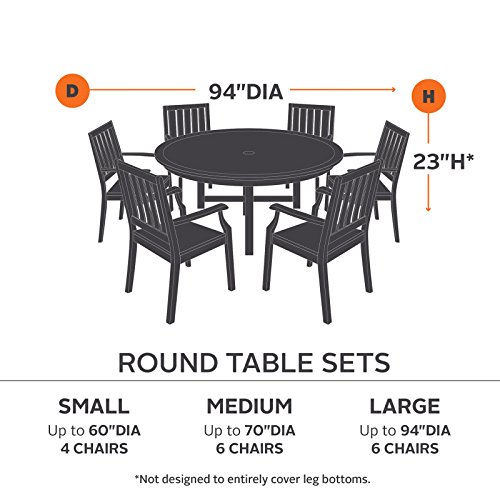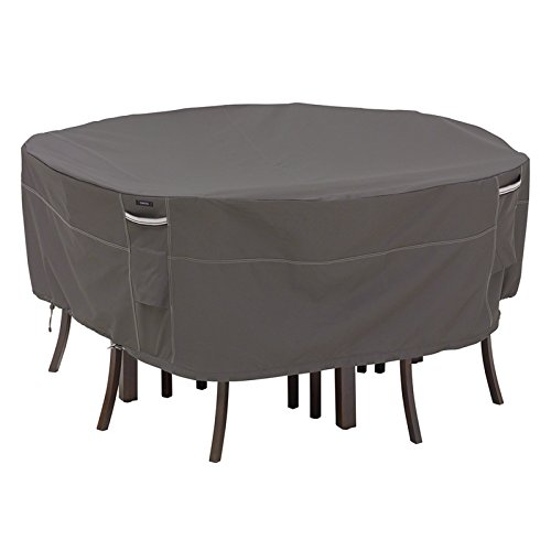 The Classic Accessories Ravenna Round Patio Table & Chair Cover - Taupe is a stylish way to keep your outdoor dining table and chairs protected from the elements. It comes in taupe to look fantastic on your patio or deck and features double-stitched seams and reinforced, padded handles. Structured, mesh-lined vents prevent wind lofting and mildew. The adjustable webbing belts slide easily for a tailored look and four custom-colored buckles keep your cover secure in any weather. The cover has a waterproof backing and comes in your choice of size to fit around table plus chairs. Includes a generous four-year manufacturer's warranty. Patent pending. Dimensions: Medium: Fits up to 70 diam. x 23H in. Large: Fits up to 94 diam. x 23H in. Founded from small beginnings, Classic Accessories has grown in the past 30 years from a small basement operation in Seattle's Roosevelt neighborhood making seatbelt pads and steering wheel covers, to a successful and expanding company now making a wide variety of products from car to boat covers and much more. Innovative, stylish designs define products that are functional and made to last. From little details to the largest innovations, Classic Accessories is always moving forward and looking to provide cover and storage solutions to a clientele that has a passion for the outdoors, from backyard gatherings to exciting camping trips, Classic Accessories provides the products that keeps your equipment looking great all season long. Taupe color complements your outdoor living space. Reinforced padded handles and double-stitched seams. Structured, mesh-lined vents prevent wind lofting, mildew. Waterproof backing and elastic hem cords for a snug fit. 4 buckles keep cover secure in any weather. Adjustable webbing belts slide easily for a tailored look. Comes in your choice of size.